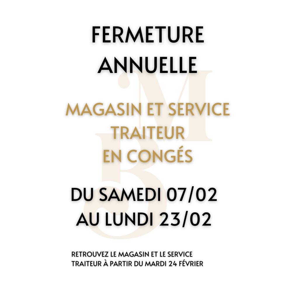 Le magasin et le service traiteur seront en congés du samedi 07 au lundi 23 février, retrouvez-nous le mardi 24 février !